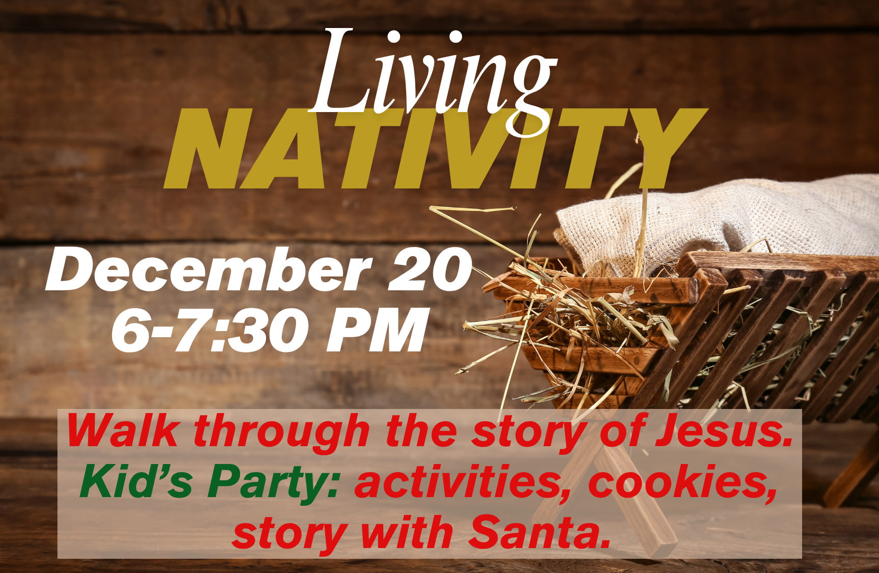 We are so excited for our living nativity! We will have real actors and real animals showing you the timeline of the birth of baby Jesus. After a walk-through, bring the kids inside to warm up! We will have crafts, hot chocolate, cookie decorating, and Santa reading the Christmas story!